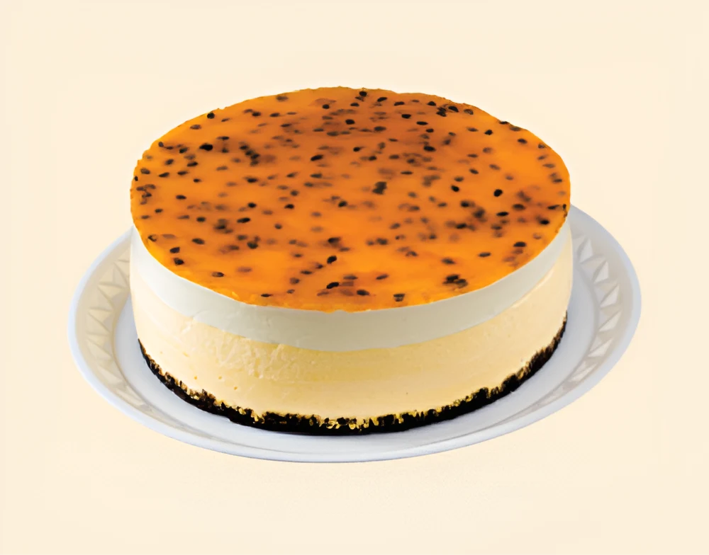 Base casquinha bisc. Negresco , mousse de maracujá, mousse de chocolate branco, geléia de maracujá.